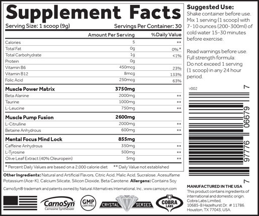 Προειδοποιήσεις: Αυτό το προϊόν προορίζεται μόνο για κατανάλωση από υγιείς ενήλικες ηλικίας 18 ετών και άνω. Να μην χρησιμοποιείται από άτομα με προϋπάρχουσες ιατρικές παθήσεις ή από εκείνους που παίρνουν φάρμακα, μικρά παιδιά κάτω των 18 ετών, έγκυες ή θηλάζουσες γυναίκες ή άτομα ευαίσθητα στην καφεΐνη ή στην Β-Αλανίνη. Διακόψτε τη χρήση και συμβουλευτείτε ένα επαγγελματία υγείας εάν αντιμετωπίσετε οποιαδήποτε ανεπιθύμητη ενέργεια σε αυτό το προϊόν. Μην το καταναλώνετε με καφεΐνη, αλκοόλ ή διεγερτικά από άλλες πηγές. Για να αποφύγετε την αϋπνία μην καταναλώνετε μέσα σε 4 ώρες πριν από την ώρα του ύπνου. Μπορεί να αντιμετωπίσετε αβλαβείς βραχυπρόθεσμα δερματικά τσιμπιματάκια. Παράγεται σε εγκατάσταση που επεξεργάζεται συστατικά γάλακτος και σόγιας. Μην το χρησιμοποιείτε εάν η σφραγισμένη ασφάλεια λείπει. Αποθηκεύστε το σε δροσερό, ξηρό μέρος. Να φυλάσσεται μακριά από παιδιά.