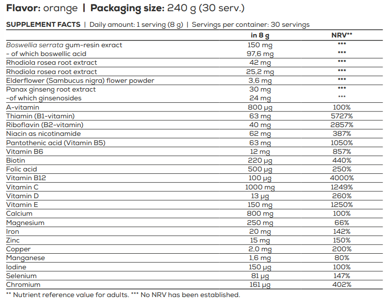 • 28,8 mg σκόνη φρούτων τριανταφυλλιάς (Rosa canina) και σκόνη λουλουδιών μαύρου σαμπούκου (Sambucus nigra)