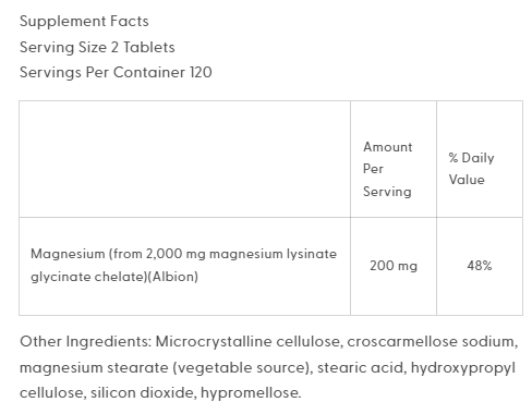 Περιέχει μαγνήσιο χηλικοποιημένο με αμινοξέα L-γλυκίνη και L-λυσίνη, παρέχοντας υψηλή απορρόφηση.
