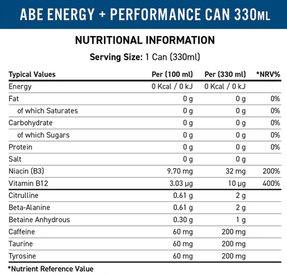 Τα αναψυκτικά ABE Energy χρησιμοποιούν 2g κιτρουλίνης, το οποίο ρόλος της είναι να υποστηρίξει τη βελτιστοποίηση της ροής του αίματος στους ιστούς, η οποία είναι ζωτικής σημασίας για τις προπονήσεις αλλά και για την μετέπειτα ανάκτηση. Επίσης περιέχει 200mg ταυρίνης για την υποστήριξη του μεταβολισμού, βοηθώντας το σώμα να χρησιμοποιεί καλύτερα την ενέργεια από τα λιπώδη κύτταρα. Επιπλέον σε κάθε κουτί έχουν προστεθεί βιταμίνες Β3 και Β12, οι οποίες βελτιώνουν τα επίπεδα λίπους στο αίμα και βοηθούν στη δημιουργία υγιών ερυθρών αιμοσφαιρίων.