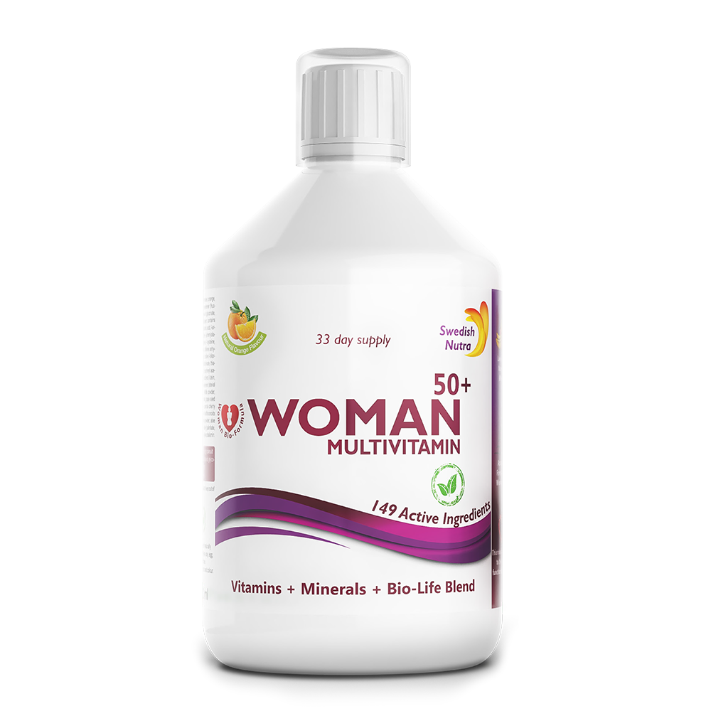 Το Swedish Nutra's Woman 50+ Multivitamin είναι μια εύγευστη υγρή πολυβιταμίνη με γεύση πορτοκάλι. Μια πλούσια φόρμουλα φυσικών θρεπτικών συστατικών που παρασκευάζεται ειδικά για την υγεία και την ευημερία των γυναικών. Το Swedish Nutra έχει να κάνει με τη διατροφική τελειότητα. Αυτή η φόρμουλα είναι γεμάτη με βιταμίνες, μέταλλα και super greens για να ενισχύσει τα επίπεδα ενέργειας και το ανοσοποιητικό σας σύστημα. Το Woman 50+ Multivitamin 500 ml καλύπτει την ημερήσια πρόσληψη βιταμινών, μετάλλων, αμινοξέων, σε μόνο 15 ml.