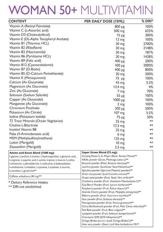Η πολυβιταμίνη Woman 50+ περιέχει μια πλούσια φόρμουλα βασισμένη σε στοιχεία που υποστηρίζει: