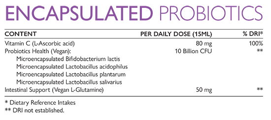 Why Encapsulated Probiotics? Vegan bifidobacterium lactis, vegan lactobacillus acidophilus, vegan lactobacillus plantarum, vegan lactobacillus salivarius, are microencapsulated to survive the intestinal gastric acids to reach the small intestine and colonize for appropriate support of immune health, prevention and management of several gastrointestinal disorders and are tyndallized for stability.