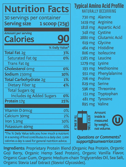 Με πρωτεΐνη μπιζελιού, το Sunwarrior Blend Organic Protein είναι μια εύπεπτη, νόστιμη, γεμάτη θρεπτικά συστατικά πρωτεΐνη ιδανική για όποιον θέλει να ενισχύσει την υγεία και τη φυσική του κατάσταση.