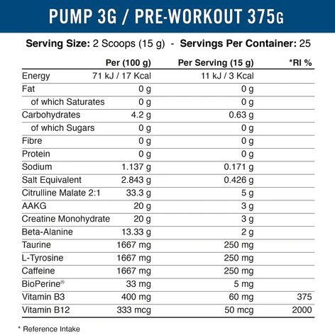 Το Pump 3G Next Generation τώρα είναι πιο συγκεντρωμένο από ποτέ, στοιβάζεται με μια σειρά από τα πιο δημοφιλή και ερευνημένα συστατικά για τη βελτίωση της αιμάτωσης, της αυτοσυγκέντρωσης και της απόδοσης. Το Pump 3G από την Applied Nutrition διαμορφώθηκε ενώ είχε προτεραιότητα την βελτίωση της αιμάτωσης σε όλα τα στάδια ανάπτυξης προκειμένου να μεγιστοποιηθούν τα κέρδη διατηρώντας παράλληλα μια ισχυρή δόση διεγερτικού.