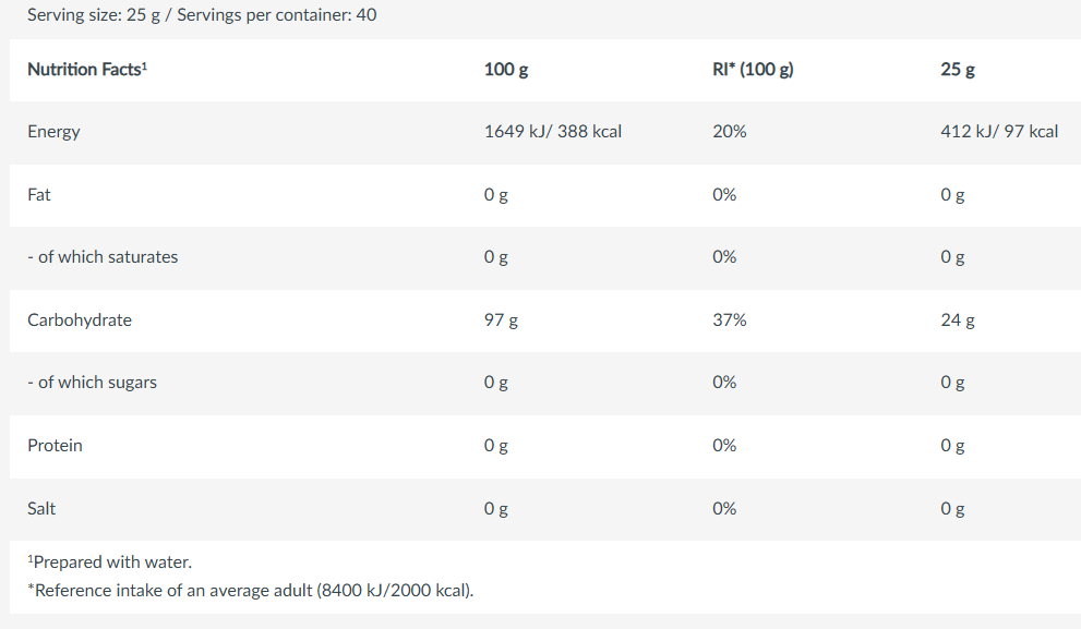 - Περιέχει 100% Cluster Dextrin, εξασφαλίζοντας ένα ποιοτικό υδατάνθρακα χωρίς περιττά πρόσθετα.