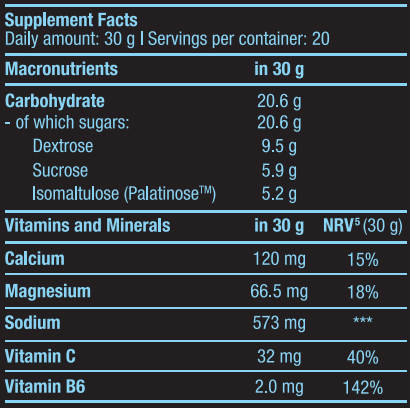 Dextrose 38%, sucrose 20%, isomaltulose4 (PalatinoseTM) 18%, sodium citrate 8.5%, flavourings, acid (citric acid), calcium salts of citric acid 1.9%, 3magnesium bisglycinate 1.8%, L-ascorbic acid, colours (tartrazine, Allura Red AC)5, pyridoxine hydrochloride. 4Isomaltulose is a source of glucose and fructose. 5Tartrazine, Allura Red AC: may have an adverse effect on activity and attention in children.