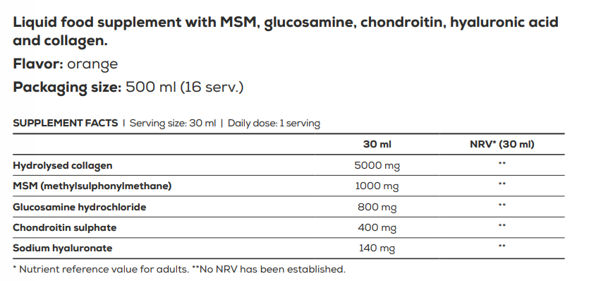 Υγρό συμπλήρωμα διατροφής με MSM, γλυκοζαμίνη, χονδροϊτίνη, υαλουρονικό οξύ και κολλαγόνο.