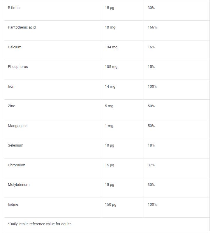 Η περιεκτικότητα του προϊόντος σε ψευδάργυρο συμβάλλει στη διατήρηση των φυσιολογικών επιπέδων τεστοστερόνης στο αίμα, ενώ το ιώδιο του προϊόντος, εκτός από ψευδάργυρο, συμβάλλει και στη διατήρηση της φυσιολογικής πνευματικής λειτουργίας. Από τη σύνθετη σύνθεση του προϊόντος, η βιταμίνη C, η νιασίνη, η ριβοφλαβίνη, η βιταμίνη Β6 και η βιταμίνη Β12 συμβάλλουν στη μείωση της κούρασης και της κόπωσης.