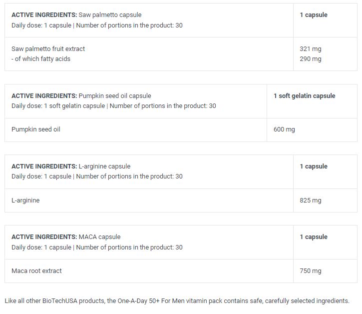 Η εμπειρία σας κάνει σοφότερους, αλλά πρέπει επίσης να ξέρετε ότι εάν χρειάζεστε μια αλλαγή, από πού και με τι πρέπει να ξεκινήσετε. Σε διαφορετικά στάδια της ζωής, μπορεί να χρειάζεστε διαφορετικές λύσεις για να πετύχετε τους στόχους σας, καθώς, μεταξύ άλλων, αλλάζουν οι ανάγκες του σώματός σας σε βιταμίνες και μέταλλα. Γι' αυτό δημιουργήσαμε το πακέτο συμπληρωμάτων διατροφής One-A-Day 50+ For Men, ειδικά προσαρμοσμένο στις ανάγκες των ανδρών άνω των 50. Δεν είναι εύκολο να το αλλάξετε καθώς μεγαλώνετε, αλλά ποτέ δεν είναι αδύνατο! Φέρτε ξανά στη ζωή σας την ενεργητική καθημερινότητα, ασκείστε περισσότερο, τρώτε μια ισορροπημένη διατροφή, επιλέξτε τα συμπληρώματα διατροφής που σας ταιριάζουν καλύτερα και απολαύστε τα αποτελέσματα ενός υγιεινού τρόπου ζωής!