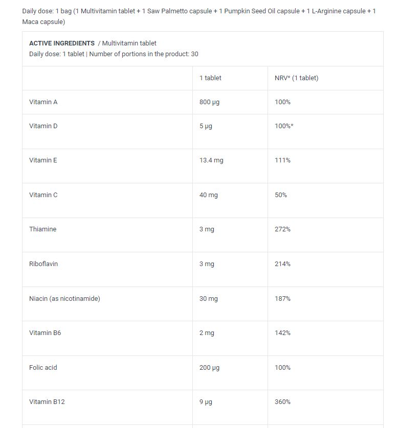 Πολυβιταμινούχα δισκία: άλατα που σχηματίζονται με ορθοφωσφορικό οξύ ασβεστίου, παράγοντας διόγκωσης (γέλη κυτταρίνης), φουμαρικός σίδηρος(II), L-ασκορβικό οξύ, οξικός DL-άλφα-τοκοφερυλεστέρας [οξικός DL-άλφα-τοκοφερυλεστέρας, αντισυσσωματικός παράγοντας (διοξείδιο του πυριτίου) ], επίστρωση { σταθεροποιητές [συμπολυμερές μοσχευμάτων πολυ(βινυλικής αλκοόλης)-πολυ(αιθυλενογλυκόλης), πολυβινυλική αλκοόλη], αντισυσσωματικοί παράγοντες (ταλκ, μονο- και διγλυκερίδια λιπαρών οξέων)}, νικοτιναμίδιο, διςγλυκινικός ψευδάργυρος, αντισυσσωματικοί παράγοντες (άλατα μαγνησίου λιπαρών οξέων, διοξείδιο του πυριτίου), D-παντοθενικό ασβέστιο, οξικός ρετινυλεστέρας [σταθεροποιητής (αραβικό κόμμι), οξικός ρετινυλεστέρας, αντιοξειδωτικό (άλφα-τοκοφερόλη), αντισυσσωματικός παράγοντας (φωσφορικά ασβέστιο)], μολυβδαινική νιτρική νάτριο, , θειικό μαγγάνιο, ριβοφλαβίνη, υδροχλωρική πυριδοξίνη, σεληνικό νάτριο, παρασκεύασμα βιταμίνης D [άμυλο αραβοσίτου, παχυντικό (αραβικό κόμμι), αντισυσσωματικό (διοξείδιο του πυριτίου), αντιοξειδωτικά (ασκορβικό νάτριο, εκχύλισμα πλούσιο σε τοκοφερόλη), χοληκαλσιφερόλη], κυανο. L-μεθυλοφολικό ασβέστιο, ιο κάλιο διδέ, χλωριούχο χρώμιο (III), D-βιοτίνη.