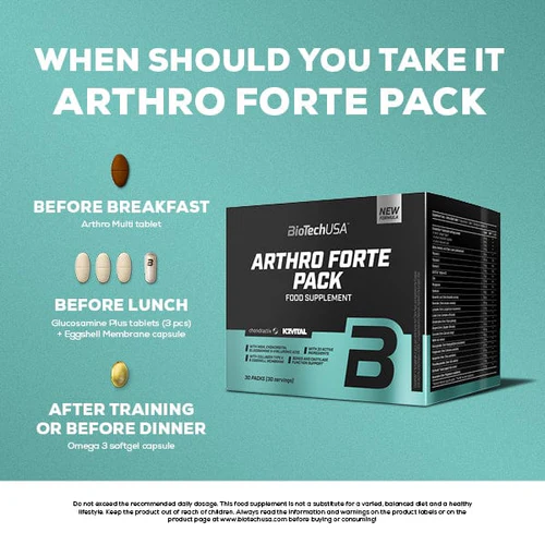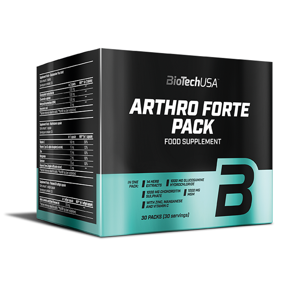 Το Arthro Forte Pack της BioTechUSA περιέχει έναν συνδυασμό σκευασμάτων που υποστηρίζουν την υγεία των αρθρώσεων, με κύρια συστατικά τη γλουκοζαμίνη, το MSM και τον κολλαγόνο. Οι κάψουλες παρέχουν θρεπτικά συστατικά όπως βιταμίνες και πηγές omega-3, προάγοντας τη συνολική ευεξία των αρθρώσεων και τη μείωση της φλεγμονής. Παράλληλα, υπάρχουν προειδοποιήσεις για την ασφαλή χρήση του προϊόντος, ώστε να αποφεύγονται κίνδυνοι για ευάλωτους πληθυσμούς.