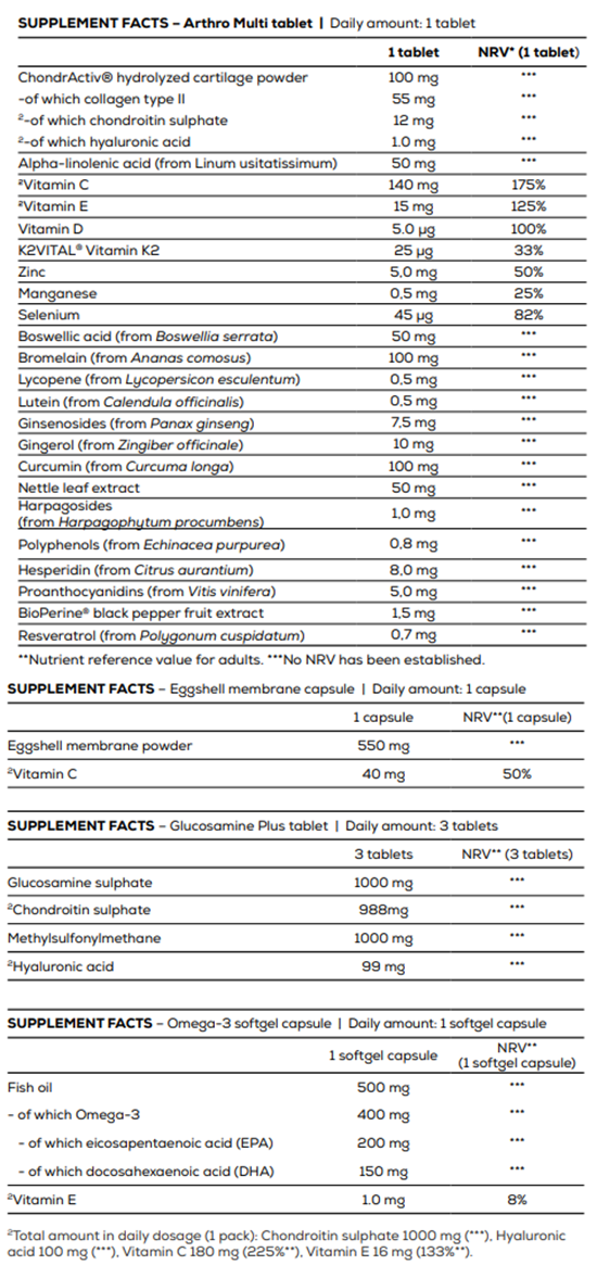 Πέρα από τις προαναφερθείσες βιταμίνες και μέταλλα, το Arthro Forte Pack περιέχει επίσης φόρμουλα ChondrActiv® με κολλαγόνο Τύπου II, υαλουρονικό οξύ και θειική χονδροϊτίνη καθώς και σκόνη μεμβράνης από κέλυφος αυγού και ιχθυέλαιο με omega-3 λιπαρά οξέα.