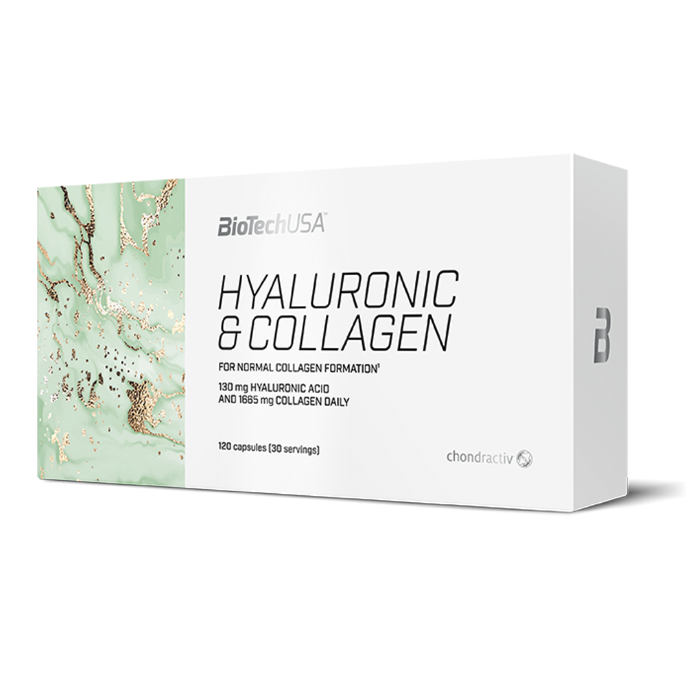 Το BioTech USA Hyaluronic & Collagen έρχεται τώρα με μια ολοκαίνουργια φόρμουλα και σε νέα συσκευασία. Η υψηλότερη* περιεκτικότητα σε κολλαγόνο παρέχεται από δύο διαφορετικές πηγές. η πατενταρισμένη φόρμουλα ChondrActiv® περιέχει υδρολυμένη σκόνη χόνδρου που παρέχει κολλαγόνο τύπου II. Το προϊόν περιέχει επίσης βιταμίνη C που συμβάλλει στον φυσιολογικό σχηματισμό κολλαγόνου για, μεταξύ άλλων πλεονεκτημάτων, τη φυσιολογική λειτουργία του δέρματος.1 Βρίσκεται επίσης στη φόρμουλα, η βιταμίνη Α συμβάλλει στη διατήρηση του φυσιολογικού δέρματος.1 Η φόρμουλα συμπληρώνεται με αμινοξέα τα οποία συμβάλλουν στο σχηματισμό κολλαγόνου.