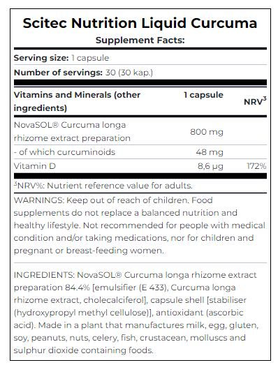 Οι κάψουλες Scitec Nutrition Liquid Turmeric περιέχουν μια αποκλειστική φόρμουλα, το υγρό εκχύλισμα ρίζας κουρκουμά NovaSOL®. Αυτή η μοναδική φόρμουλα έχει έως και 185 φορές καλύτερη βιοδιαθεσιμότητα από τον εγγενή κουρκουμά.