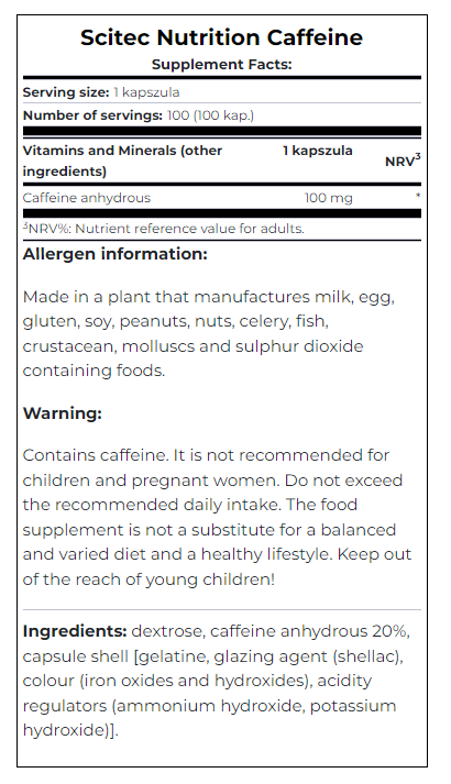 Περιέχει καφεΐνη (100mg ανά μερίδα). Δεν συνιστάται για παιδιά, έγκυες ή θηλάζουσες γυναίκες. Χρησιμοποιήστε αυτό το προϊόν σε συνδυασμό με τρόφιμα ως μέρος μιας υγιεινής, ισορροπημένης διατροφής και όχι ως υποκατάστατο αυτής.