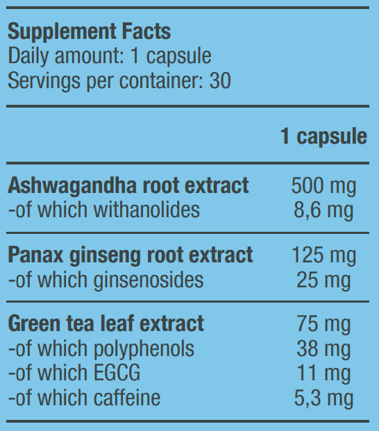 Ashwagandha extract preparation [Ashwagandha (Withania somnifera) root extract, maltodextrin] 55%, capsule shell [gelatine, glazing agent (shellac), colour (iron oxides and hydroxides), acidity regulators (ammonium hydroxide, potassium hydroxide)], korean ginseng (Panax ginseng) root extract 12%, anti-caking agents (calcium salts of orthophosphoric acid, magnesium salts of fatty acids, silicon dioxide), green tea (Camellia sinensis) leaf extract 7%.