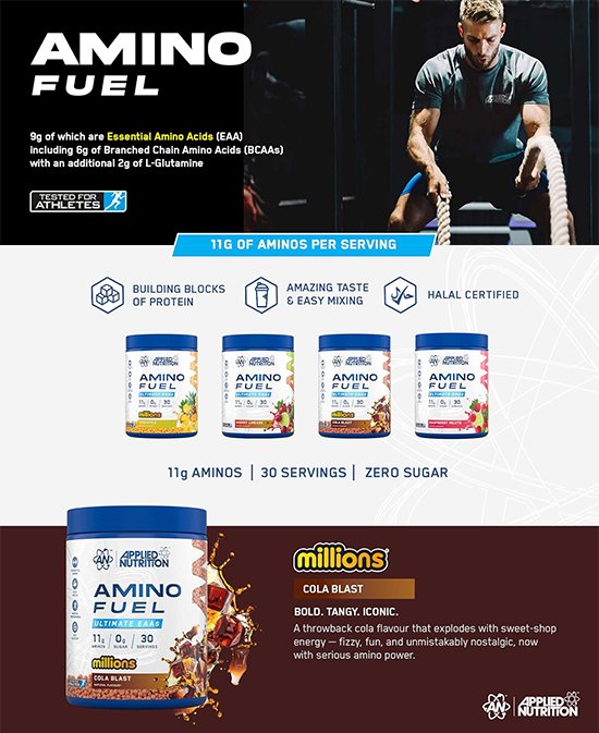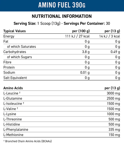 Το Amino Fuel είναι το τέλειο μείγμα που παρέχει 11g αμινοξέων ανά μερίδα, 9g εκ των οποίων είναι βασικά αμινοξέα (EAA) συμπεριλαμβανομένων 6g αμινοξέων διακλαδισμένης αλυσίδας (BCAAs) σε αναλογία 2:1:1 (3000mg L-Λευκίνη, 1500mg L- Ισολευκίνη, 1500mg L-Valine) με επιπλέον 2g L-Γλουταμίνης.