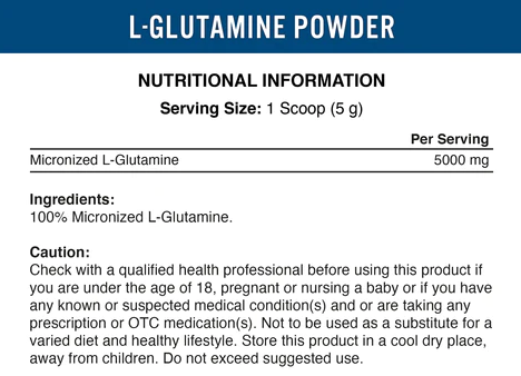 Η L-γλουταμίνη είναι ένα αμινοξύ που μπορούμε να λάβουμε από διάφορα τρόφιμα ιδιαίτερα όσα είναι πλούσια σε πρωτεΐνη τόσο ζωικής όσο και φυτικής προέλευσης. Τα επίπεδα γλουταμίνης μπορούν να μειωθούν σημαντικά καθώς διασπάται ο μυϊκός ιστός ακόμα περισσότερο.