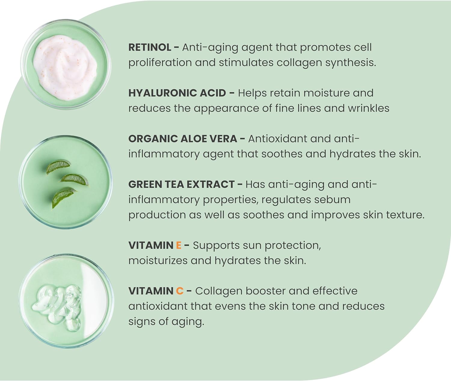 It contains hyaluronic acid which promotes collagen production and which helps reduce wrinkles, but also has the ability to help retain moisture and improve overall skin texture and tone.