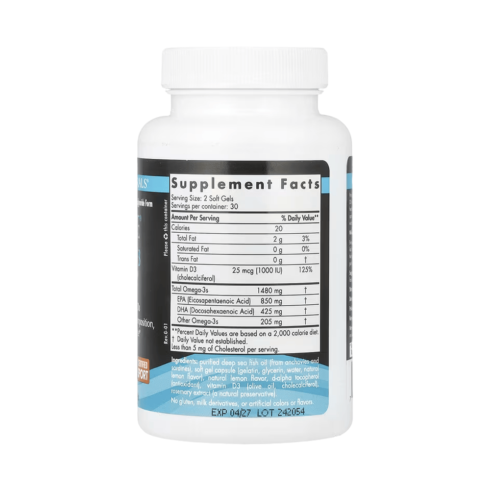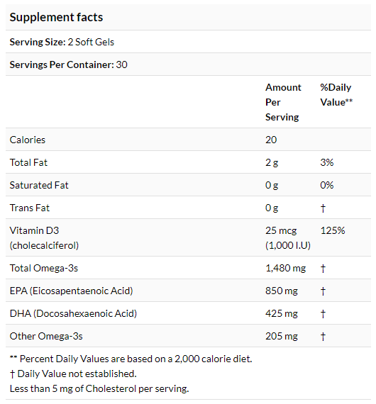 - 1480 mg ολικά ωμέγα-3, 1000 IU Βιταμίνη D3