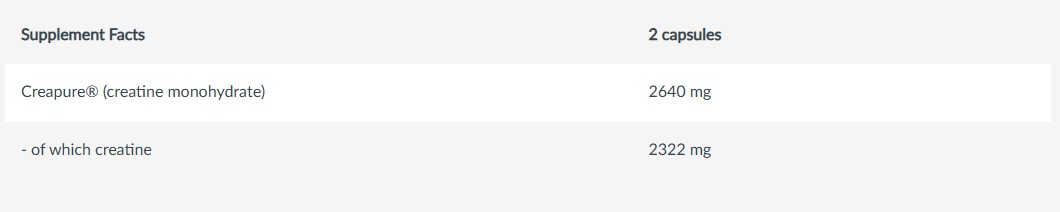 Creapure® (μονοϋδρική κρεατίνη) 88%, κέλυφος κάψουλας (ζελατίνη), αντισυσσωματικοί παράγοντες (άλατα μαγνησίου λιπαρών οξέων, διοξείδιο του πυριτίου). Παρασκευάζεται σε εργοστάσιο που παράγει γάλα, αυγά, γλουτένη, σόγια, φιστίκια, ξηρούς καρπούς, σέλινο, ψάρια, καρκινοειδή και τροφές που περιέχουν διοξείδιο του θείου.
