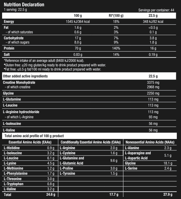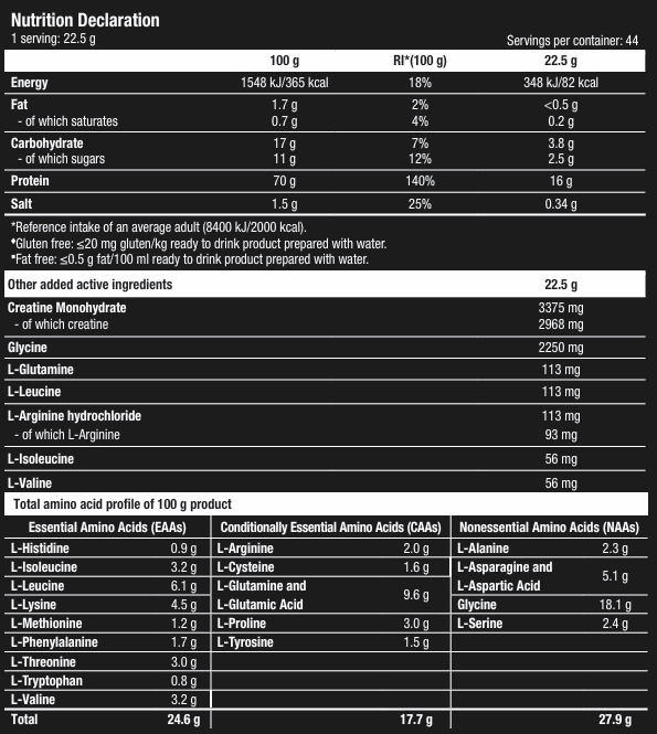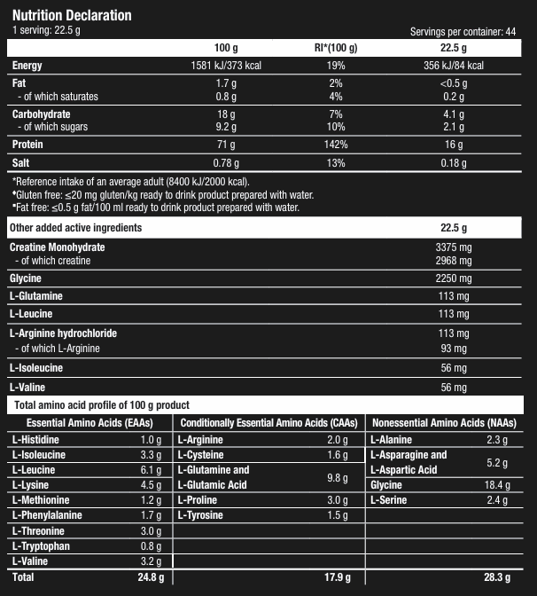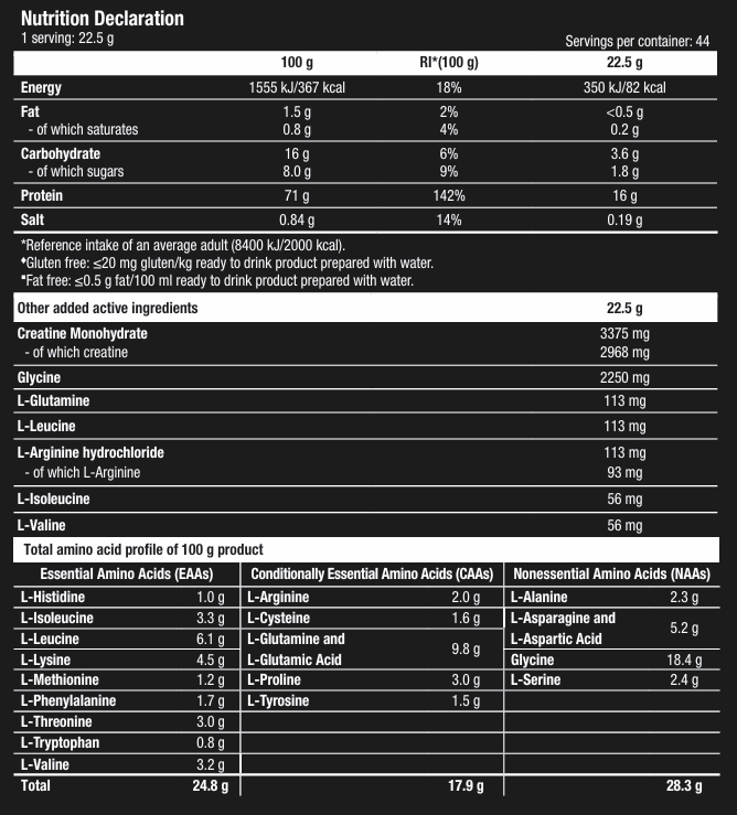 INGREDIENTS: instant whey proteins (milk) {whey protein concentrate (milk), emulsifier [lecithins (soy)], whey protein isolate (milk)}, maltodextrin, creatine monohydrate, skimmed milk powder, Glycine, flavourings, salt, thickener (xanthan gum), colour (ammonia caramel), L-Leucine¹, L-Glutamine, L-Arginine hydrochloride, L-Isoleucine¹, L-Valine¹, sweeteners (acesulfame K, sucralose). ¹BCAAs: branched chain amino acids. Made in a plant that manufactures egg, peanuts, nuts, celery, fish, crustacean and sulphur dioxide containing foods.