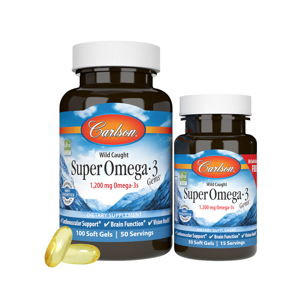 Βελτιώστε την καρδιαγγειακή, εγκεφαλική και οπτική σας υγεία με το Carlson Super Omega-3 Gems, ένα υψηλής ποιότητας συμπλήρωμα ιχθυελαίου από άγρια, βιώσιμα αλιευμένα ψάρια. Κάθε δόση παρέχει 1.200mg καθαρών Omega-3 λιπαρών οξέων EPA & DHA, σε εύπεπτες softgel κάψουλες χωρίς επίγευση ψαριού.