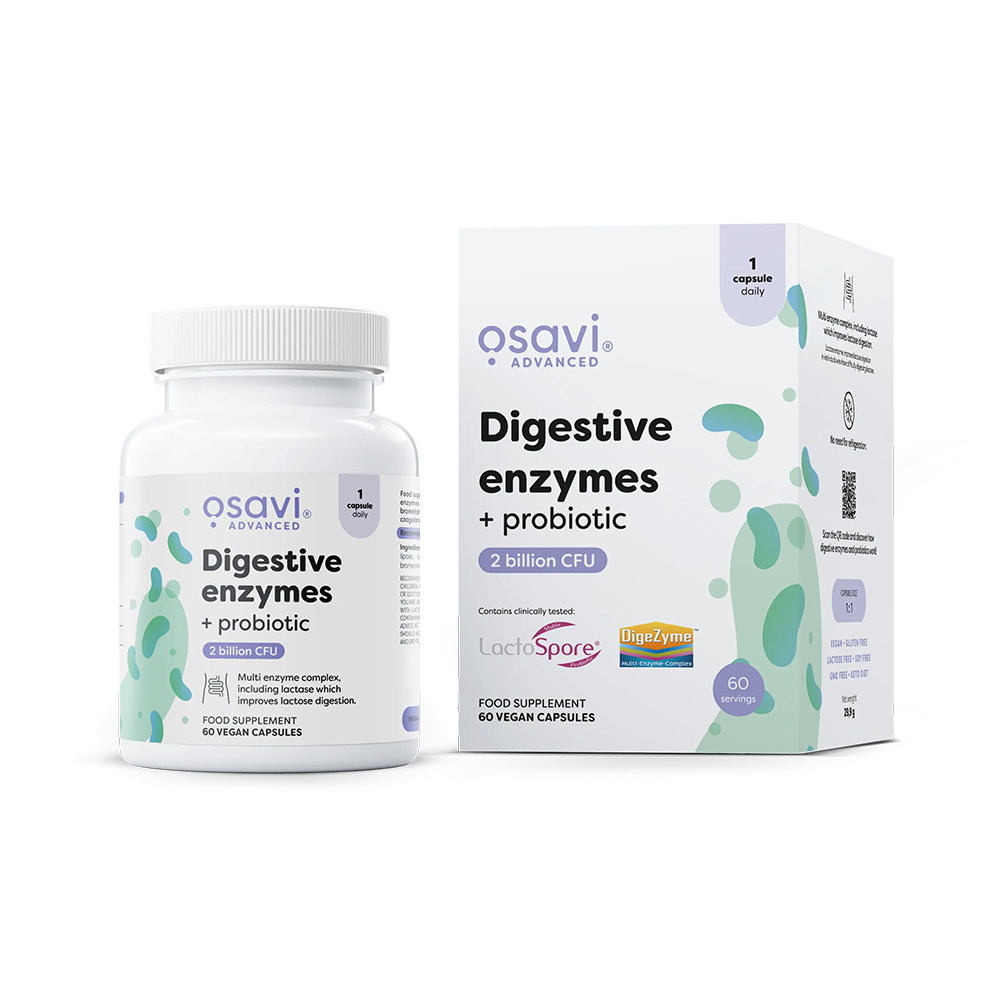 Το Osavi Digestive Enzymes + Probiotic πρόκειται για ένα μοναδικό συνδυασμό πεπτικών ενζύμων και προβιοτικού, ειδικά σχεδιασμένο για την υποστήριξη της πέψης και της γαστρεντερικής ισορροπίας. Η φόρμουλα περιέχει το κλινικά μελετημένο μείγμα ενζύμων DigeZyme®, τα πρωτεολυτικά ένζυμα Παπαΐνη και Βρομελίνη, καθώς και το σταθερό και κλινικά τεκμηριωμένο προβιοτικό LactoSpore® (Heyndrickxia coagulans MTCC 5856).