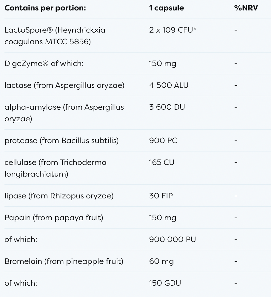 - Περιέχει κλινικά ελεγμένα και σταθερά συστατικά (DigeZyme® & LactoSpore®)