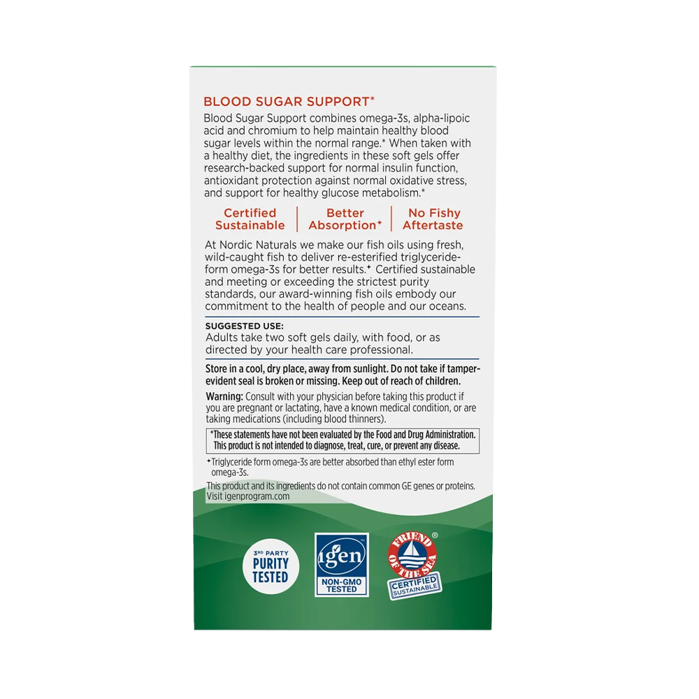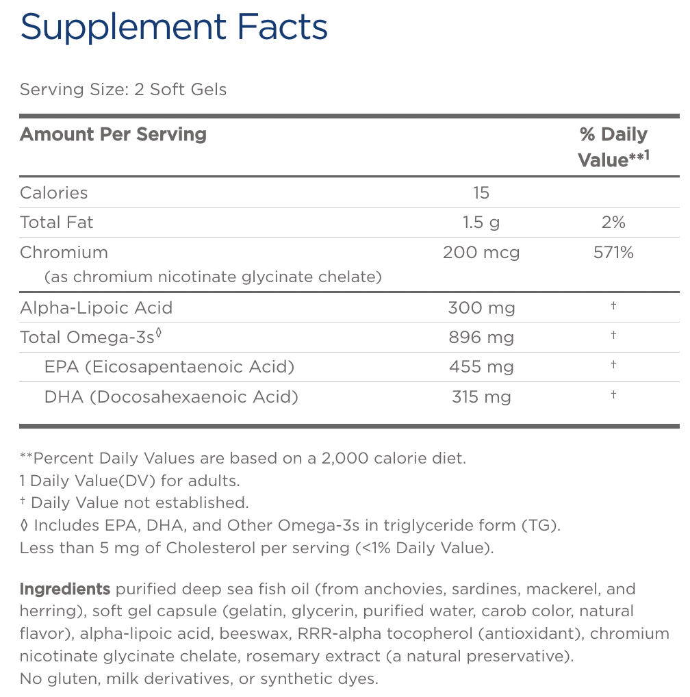 Το Blood Sugar Support είναι ένα συνεργιστικό μείγμα omega-3 ιχθυελαίου με χρώμιο και ALA για την υποστήριξη υγιών επιπέδων σακχάρου στο αίμα όταν χρησιμοποιείται σε συνδυασμό με μια υγιεινή διατροφή*