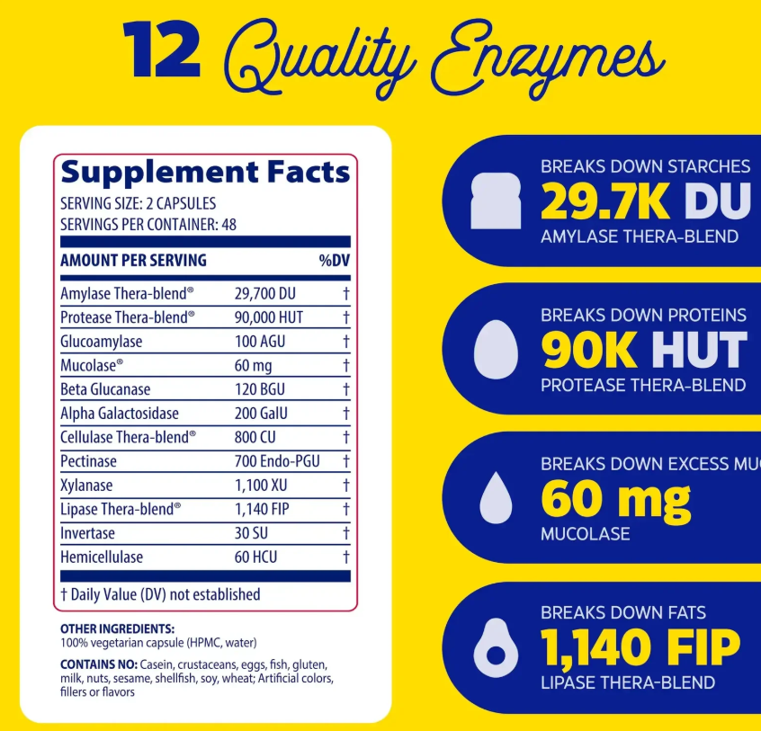 Τα ένζυμα είναι φυσικές πρωτεΐνες που επιταχύνουν τις βιολογικές διεργασίες, όπως η πέψη. Το ένζυμο Mucolase™ έχει ειδικά σχεδιαστεί για τη διάσπαση της βλέννας, βοηθώντας τον οργανισμό να την αποβάλει με φυσικό τρόπο. Επιπλέον, τα ένζυμα πρωτεάσης και αμυλάσης που περιέχονται στο MucoStop™ ενισχύουν τη συνολική δράση του συμπληρώματος στην υποστήριξη της αναπνευστικής λειτουργίας.