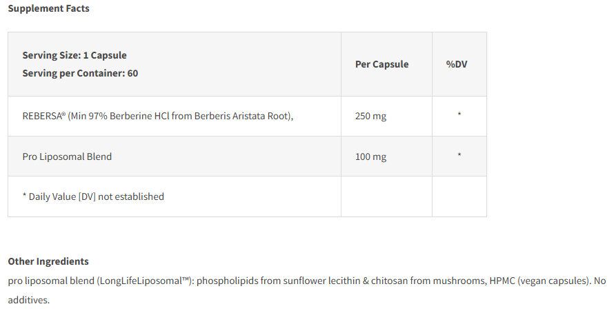 - Σε αντίθεση με τα παραδοσιακά υγρά λιποσωμικά προϊόντα, η Berberine έρχεται σε εύκολες στην κατάποση κάψουλες, αποφεύγοντας την πικρή γεύση των υγρών συμπληρωμάτων.