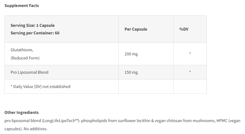 Περιέχει φωσφολιπίδια από οργανική λεκιθίνη ηλίανθου και χιτοζάνη, τα οποία συμβάλλουν στη δημιουργία ουδέτερων λιποσωμάτων για την καλύτερη απορρόφηση της Γλουταθειόνης. (LongLifeLipoTech™).
