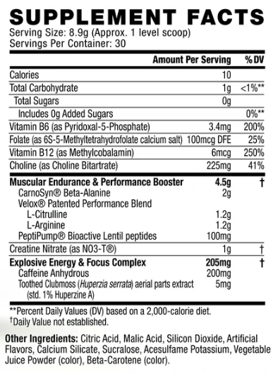 Περιέχει την κλινικά μελετημένη βήτα-αλανίνη CarnoSyn®, η οποία συμβάλλει στην καταπολέμηση της μυϊκής κόπωσης. Η τακτική χρήση της ενισχύει την αντοχή, επιτρέποντας περισσότερες επαναλήψεις και πιο έντονες προπονήσεις.