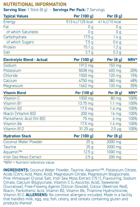 BLUE RASPBERRY: Coconut Water Powder, Taurine, Aquamin™, Potassium Citrate, Acids (Citric Acid, Malic Acid), Magnesium Citrate, Magnesium Bisglycinate, Pink Himalayan Crystal Salt, Irish Sea Moss Extract (15:1), Flavouring, Sodium Citrate, Calcium Bisglycinate, Vitamin C (L-Ascorbic Acid), Sweetener (Sucralose), Free-Flowing Agents (Silicon Dioxide), Niacin, Pantothenic Acid, Vitamin B2, Vitamin B6, Vitamin B1, Colour (Brilliant Blue FCF), Vitamin B12.