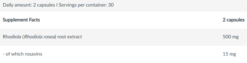 Rhodiola (Rhodiola rosea) root extract 51%, bulking agent (cellulose gel), capsule shell [gelatine, glazing agent (shellac), colour (iron oxides and hydroxides), acidity regulators (ammonium hydroxide, potassium hydroxide)], anti-caking agents (magnesium salts of fatty acids, silicon dioxide).