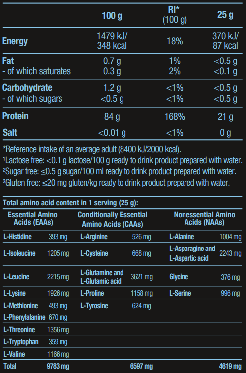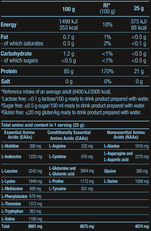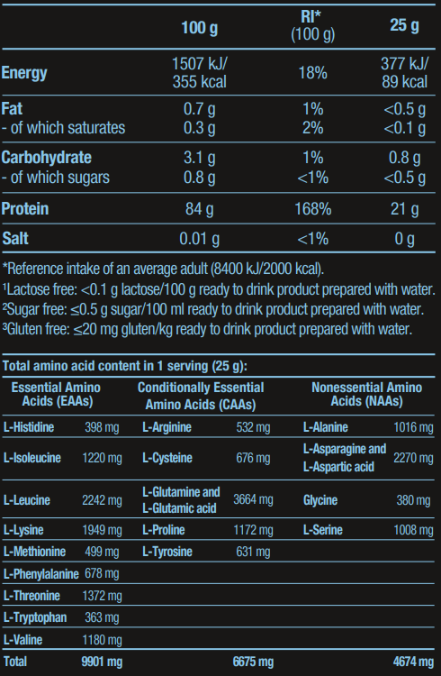 - Πλούσιο σε αμινοξέα διακλαδισμένης αλύσου (BCAAs), τα οποία είναι κρίσιμα για την πρωτεϊνοσύνθεση και την ταχεία αποκατάσταση μετά την προπόνηση.