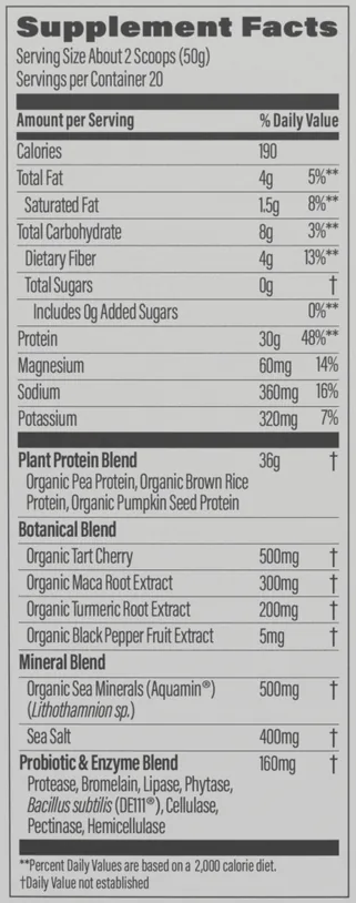 Included in the Facts Panel: Plant Protein Blend: Organic Pea Protein, Organic Brown Rice Protein, Organic Pumpkin Seed Protein, Organic Tart Cherry, Organic Maca (root) Extract, Organic Turmeric (root) Extract, Black Pepper (fruit) Extract Mineral Blend: Organic Aquamin® Sea Minerals (Lithothamnium corallioides), Sea Salt Probiotic & Enzyme Blend: Protease, Bromelain, Lipase, Phytase, Bacillus subtilis (DE111®), Cellulase, Pectinase, Hemicellulase Other Ingredients: Organic Chocolate Flavor, Organic Dutch Cocoa, Organic MCT Oil, Organic Coconut Milk Powder, Organic Guar Gum, Organic Stevia Leaf Extract (Steviol Glycosides).  Contains Coconut.