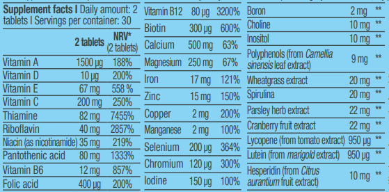 Contains niacin (vitamin B3), riboflavin (vitamin B2), vitamin B6, vitamin B12, thiamin (vitamin B1), biotin (vitamin B7), pantothenic acid, vitamin C, iron, calcium, magnesium, copper and iodine. All of these contribute to normal energy-producing metabolism. In addition, niacin, riboflavin, pantothenic acid, folic acid, vitamin B6, vitamin B12, magnesium and iron also help to reduce tiredness and fatigue.