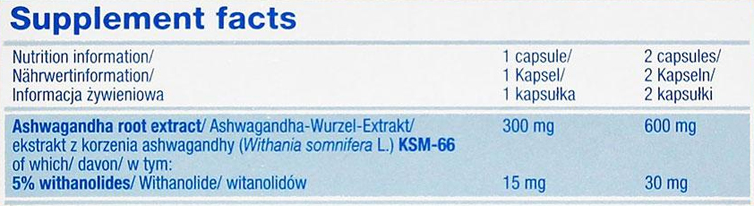 Ingredients: KSM-66® ashwagandha root extract (Withania somnifera (L.) Dunal), bulking agent – microcrystalline cellulose; anti-caking agents – magnesium salts of fatty acids, silicon dioxide; capsule – gelatine.
