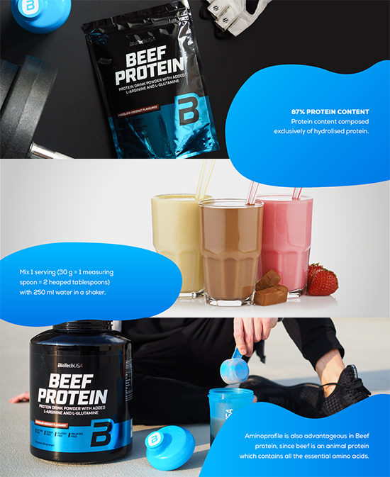 BioTechUSA Beef Protein is an 87% hydrolyzed protein complex, lactose and gluten free, ideal for low fat and low sugar diets. It contains additional amino acids such as L-Glutamine and L-Arginine and is suitable for people following the Paleo diet.