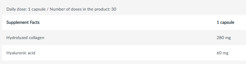 Hydrolyzed collagen 38%, bulking agent (calcium phosphates), capsule shell [gelatin, gloss (shellac), color (iron oxides and iron hydroxides), acidity regulators (ammonium hydroxide, potassium hydroxide)], hyaluronic acid 9% (soy), anti-caking agents (silicon dioxide, magnesium salts of fatty acids).