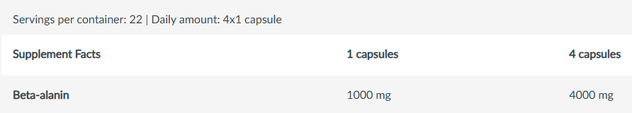 Beta alanine (84%), capsule shell [gelatine, glazing agent (shellac), colour (iron oxides and hydroxides), acidity regulator (ammonium hydroxide), acidity regulator (potassium hydroxide)], anti-caking agents (magnesium salts of fatty acids, silicon dioxide).