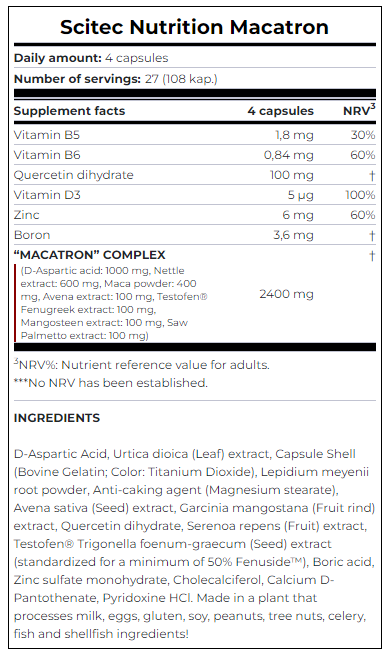 Scitec Nutrition Macatron is a highly advanced and complete testosterone, estrogen and libido support complex. Its composition is based on 13 powerful ingredients, designed to work synergistically to maximize male vitality and physical performance.
