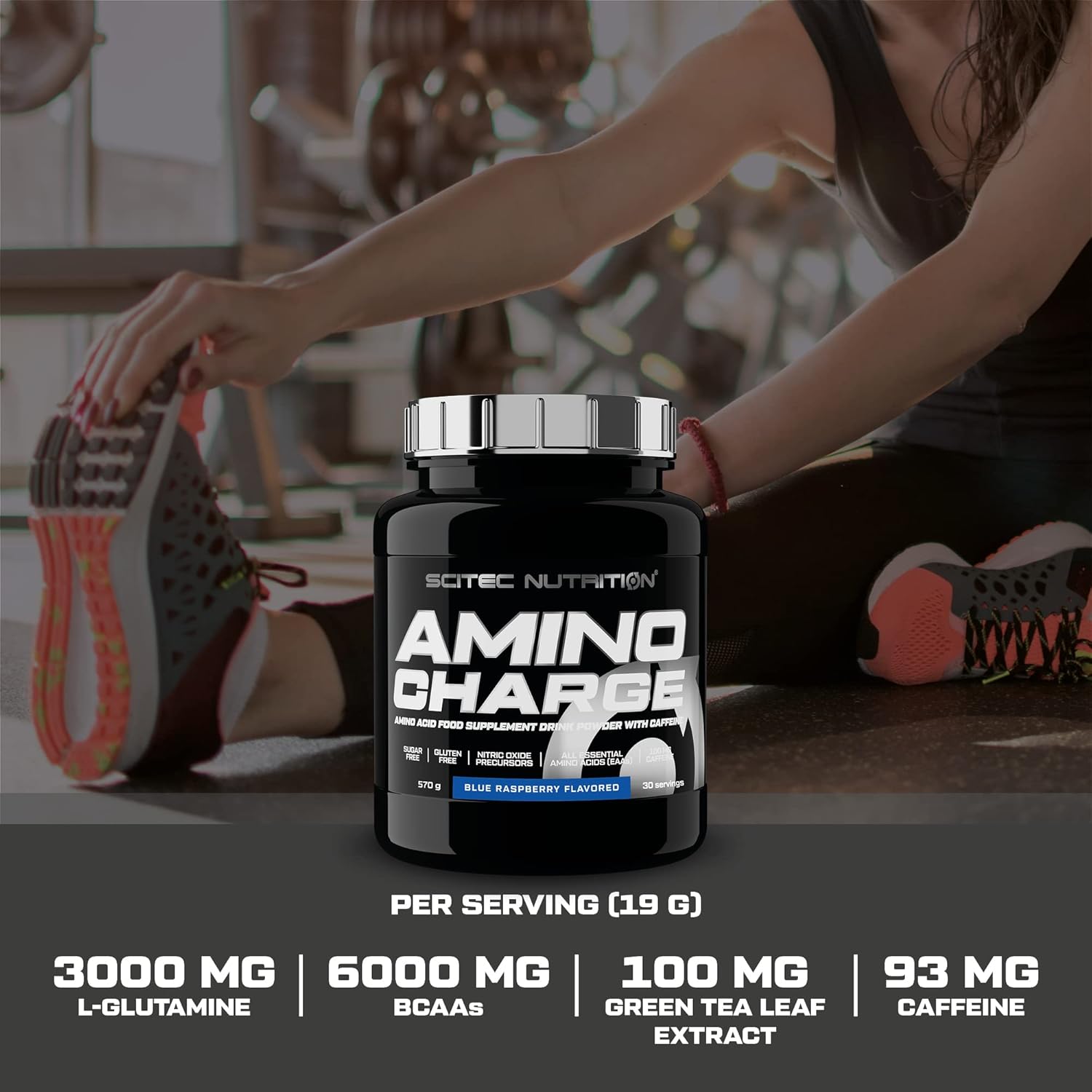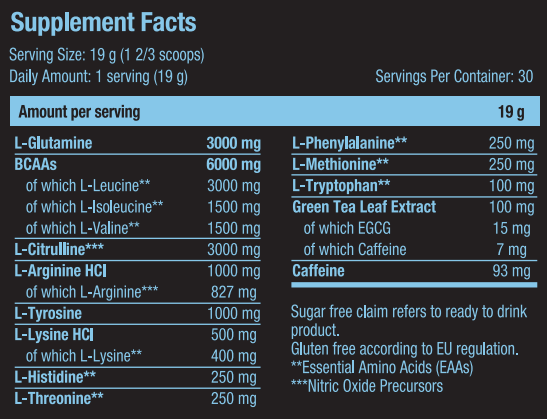 Blue raspberry: L-Glutamine 16%, L-Leucine 16%, L-Citrulline 16%, L-Valine 7.9%, L-Isoleucine 7.9%, flavourings, acid (citric acid), L-Arginine HCl 5.3%, L-Tyrosine 5.3%, L-Lysine HCl 2.6%, L-Histidine 1.3%, L-Threonine 1.3%, L-Phenylalanine 1.3%, L-Methionine 1.3%, sweeteners (sucralose, acesulfame K), salt, acidity regulator (potassium phosphates), L-Tryptophan 0.5%, green tea (Camellia Sinensis) leaf extract, anti-caking agent (magnesium salts of fatty acids), emulsifier [lecithins (soy)], caffeine anhydrous 0.5%. Made in a plant that manufactures milk, egg, peanuts, nuts, celery, fish, crustacean and sulphur dioxide containing foods.