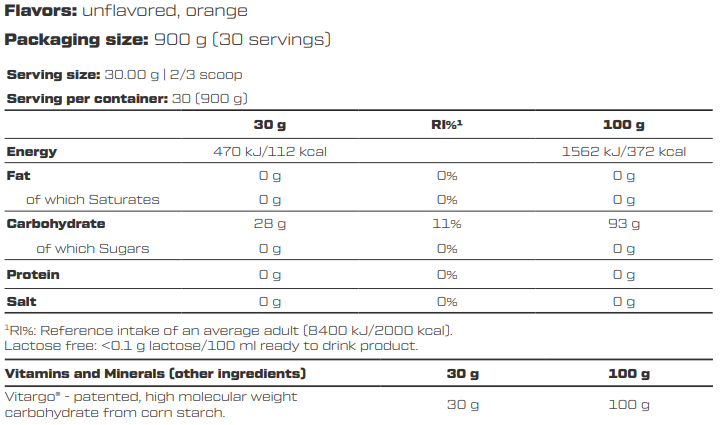 VITARGO! περιέχει Vitargo®, έναν πατενταρισμένο υδατάνθρακα υψηλού μοριακού βάρους με μέσο μοριακό βάρος 500.000-700.000. Είναι μοναδικό, επειδή είναι ειδικά επεξεργασμένο για να δώσει ένα μοριακό προφίλ που είναι πολύ διαφορετικό από τα σάκχαρα (π.χ. γλυκόζη, φρουκτόζη) και τη μαλτοδεξτρίνη που βρίσκονται σε πολλά προϊόντα. Το μοριακό βάρος της μαλτοδεξτρίνης είναι περίπου 1.000-10.000 και η δεξτρόζη είναι περίπου 180!