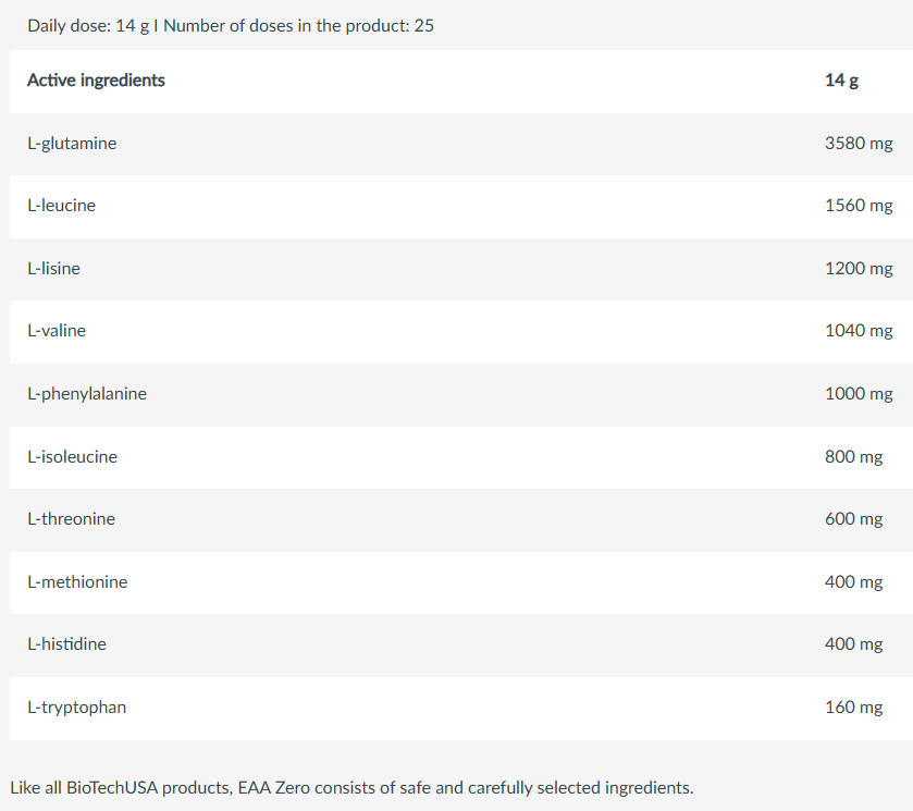 Το EAA Zero της BioTech USA είναι σχεδιασμένο για αθλητές και δραστήρια άτομα που επιθυμούν τη μέγιστη υποστήριξη της μυϊκής τους αποκατάστασης. Η σύνθεση του εστιάζει στην παροχή των απαραίτητων αμινοξέων (Essential Amino Acids) τα οποία ο ανθρώπινος οργανισμός αδυνατεί να συνθέσει από μόνος του, καθιστώντας την πρόσληψη τους μέσω της διατροφής.