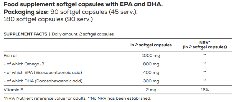 Το DHA σε κάψουλες softgel Omega 3 συνεισφέρει στη διατήρηση της φυσιολογικής όρασης, καθώς και στην κανονική λειτουργία του εγκεφάλου *, ενώ η βιταμίνη Ε συμβάλλει στην προστασία των κυττάρων από το οξειδωτικό στρες.